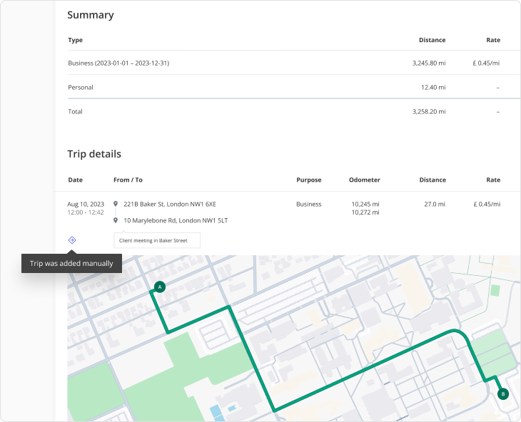Automatic tracking keeps logs precise, while manually added trips are highlighted and shown on a map — making it easy to verify claims and prevent inflated mileage.